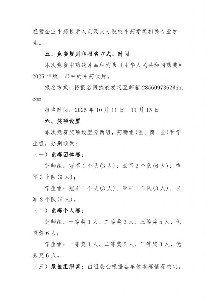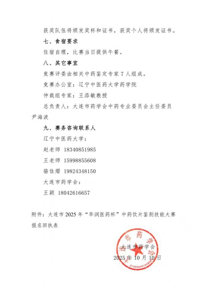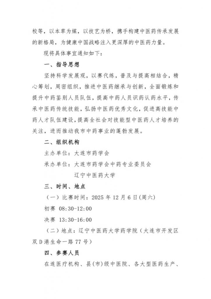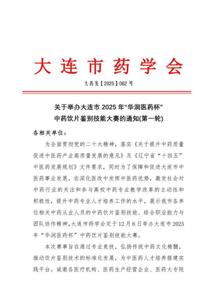 大连市药学会将于2025年12月6日举办“华润医药杯”中药饮片鉴别技能大赛。本次赛事由大连市药学会主办,大连市药学会中药专业委员会及辽宁中医药大学承办。现诚邀全市各医疗机构、医药生产经营企业、医药大专院校等单位人员踊跃参赛。